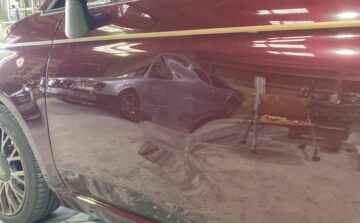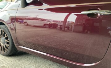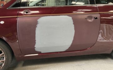 堺市在住のお客様よりフィアット500、左ドアヘコミ修理のご依頼を頂きました。なるべくお安くとの事でかなり大きなヘコミですが鈑金(板金)修理で進めさせて頂きました。