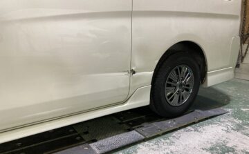堺市在住のお客様より日産キャラバン、左スライドドア、リアヘェンダーのキズ、ヘコミ板金修理ご依頼を頂きました。ホームページをご覧になってのご来店でした。ヘコミを拝見した所かなりの損傷だった為パネル交換をお勧めしたのですが、なるべくお安くとの事でしたので何とか板金修理で頑張ってみました。
