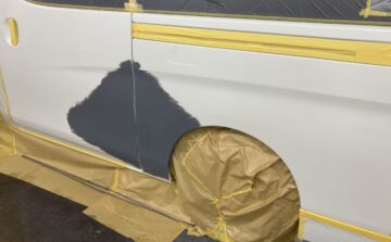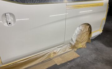 板金が無事に終わって次はペイント作業です。車体色に調合した塗料で違和感なくペイント開始です♪
