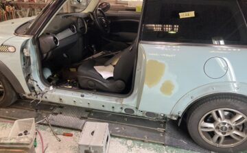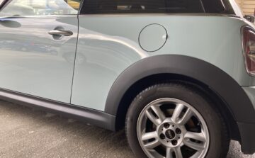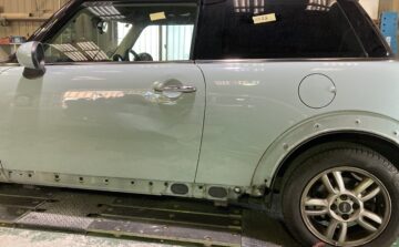 堺市在住のお客様よりミニクーパーの左側面事故、修理ご依頼を頂きました。ホームページをご覧になってのご来店でした。車両保険にご加入されていたので今回は保険を使っての修理となりました。助手席側のドアは新品パーツ交換、リアヘェンダーは板金修理と言う内容です。