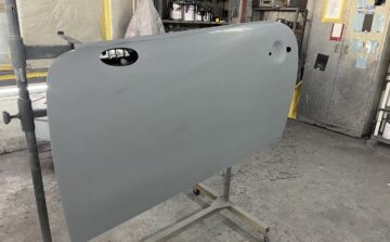 交換するドアを車体から取り外します。リアヘェンダーは板金終了、パテで細かなヘコミ一つ残さず綺麗に仕上げます