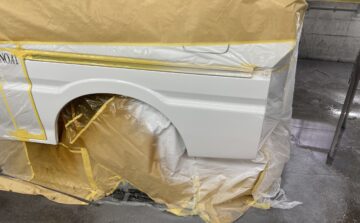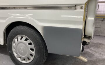 車全体をマスキングした後ペイント開始です。事前に車体色に調合した塗料で違和感なくペイントしていきます