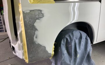 鈑金(板金)が終われば下地のサフェーサー塗装です。調色済みの塗料でペイント作業開始です