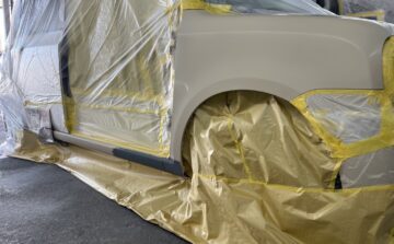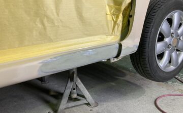 車全体をマスキングした後は調色済みの塗料でペイントします