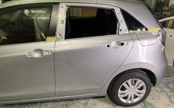 堺市在住のお客様よりホンダフィット、リアドアヘコミ修理のご依頼を頂きました。駐車場に止めている時隣の車にぶつけられてしまい、今回は相手さんの保険を使っての修理となりました。