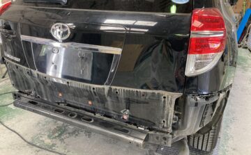 堺市在住のお客様よりトヨタ ヴァンガード、リアバンパー、リアゲートのヘコミ修理のご依頼を頂きました。駐車場でウッカリ電柱にぶつけてしまったとの事です。車両保険には加入されていなかったのでご実費での修理となりなるべくお安くとの事でリアバンパーは新品パーツに交換、リアゲートは鈑金(板金)修理で進めさせて頂きました。