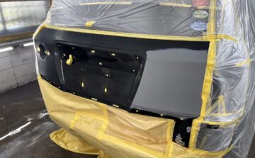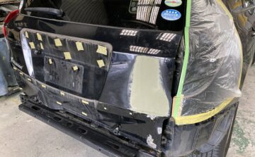 下地のサフェーサーを塗装します。その後車全体をマスキングして調色済みの塗料でペイント開始です。