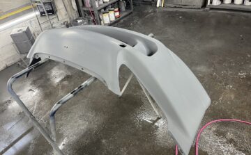 新品パーツのバンパーには塗装がされていないので下地のサフェーサーを塗装、その後調色済みの塗料でペイント開始です。