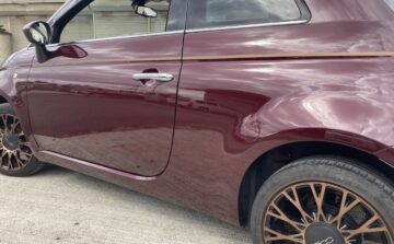 堺市在住のお客様よりフィアット500左側面事故修理のご依頼を頂きました。以前も当店をご利用頂いたお客様です。今回はブロック塀に全く気づかずにぶつけてしまったとの事です。修理代金が高額になるので今回は車両保険を使っての修理となりました。