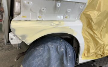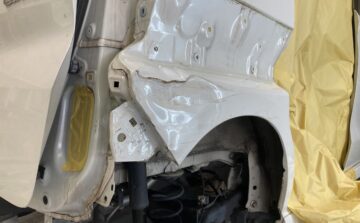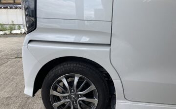 大阪狭山市在住のお客様よりホンダNボックスリアバンパー、右リアフェンダー鈑金(板金)塗装のご依頼を頂きました。信号無い交差点で出会い頭に衝突してしまい、今回は車両保険に加入していなかったので実費での修理となりました。リアフェンダー交換だと高額な修理費になる為何とか板金修理でのご希望でした。